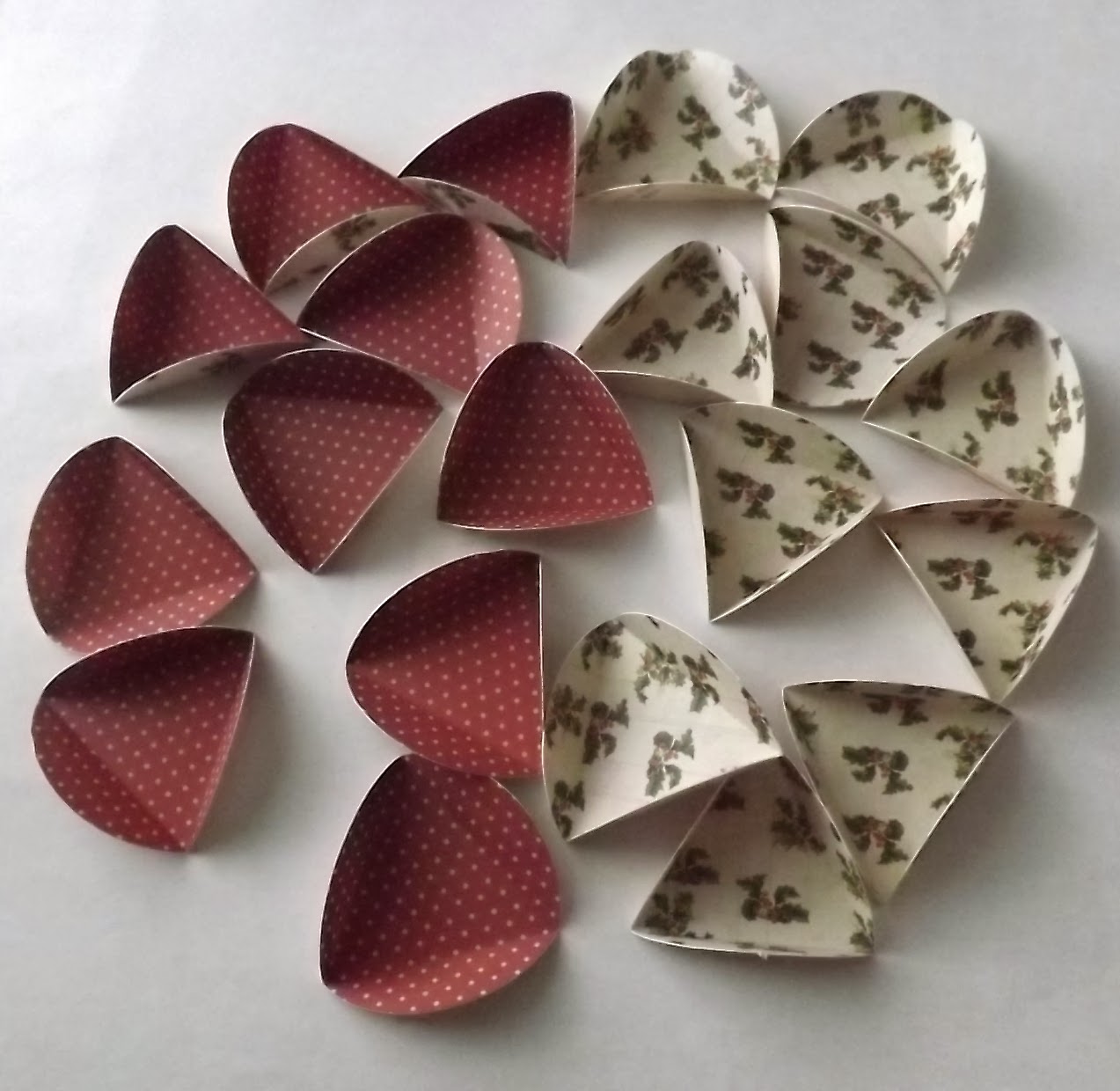 To make life easier, I used my Silhouette Cameo to cut out 20 large circles with a perforated triangle in the centre, (10 each of two paper designs) and 20 smaller (10 each of two paper designs). I have since found out that if you don't want any of the same patterned papers to be next to each other you have to use at least three colours and with 6, 6, and 8 circles of each color (wish I had found that out earlier to show you all, but you'll get the idea).